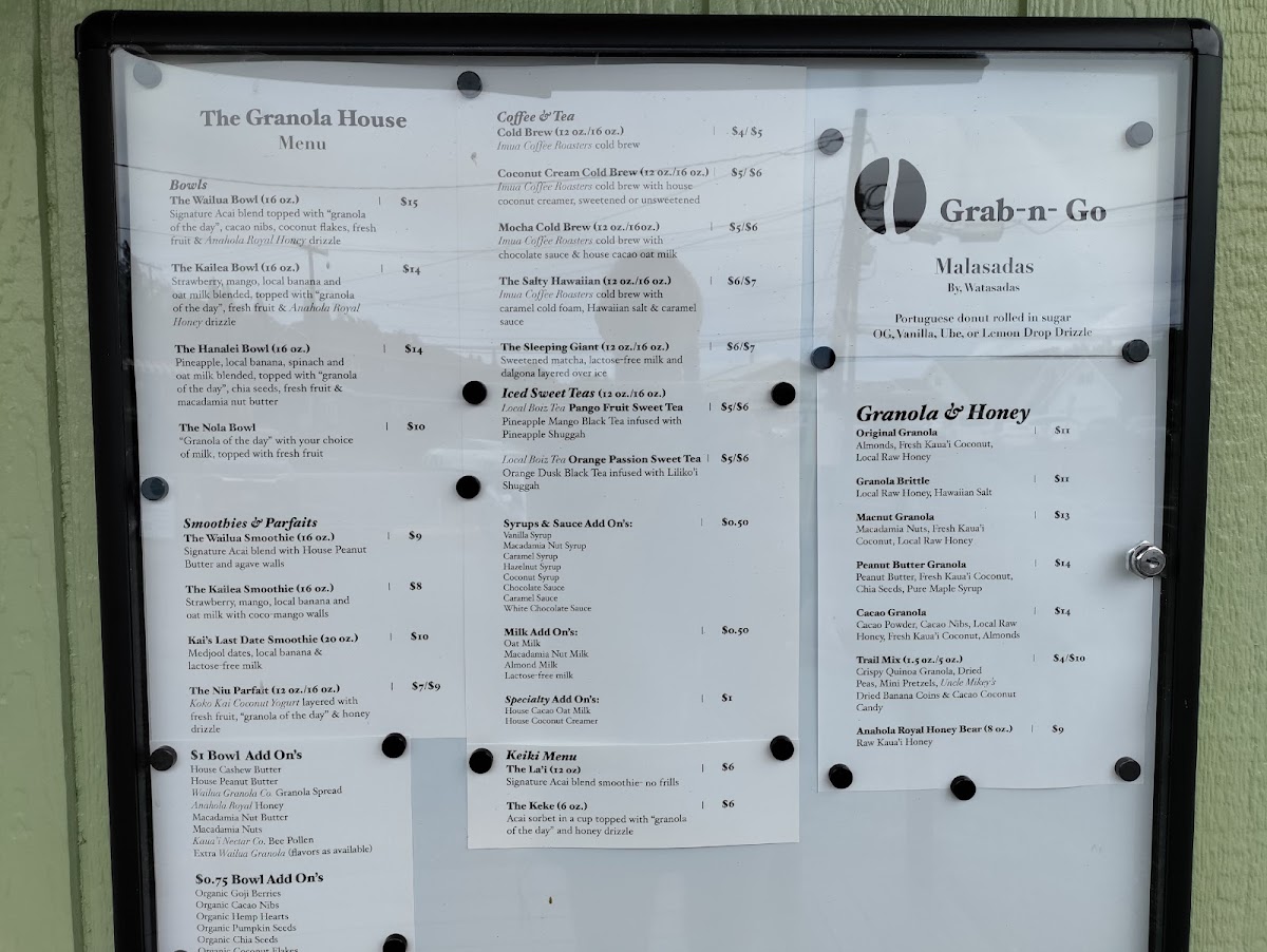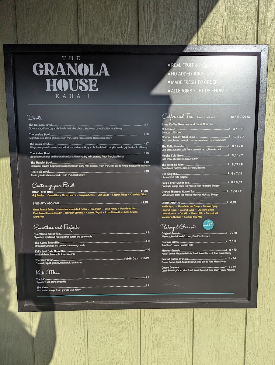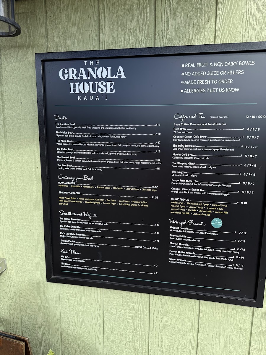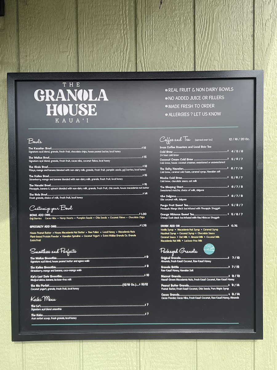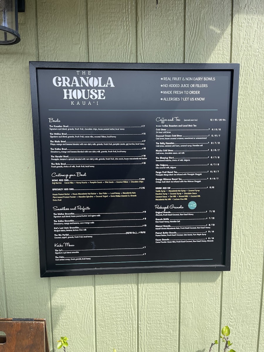 The menu at The Granola House offers a delightful variety of options for breakfast, snacks, and beverages, catering to all tastes. For those craving hearty and flavorful bowls, you can enjoy the Kauaiian Bowl, Wailua Bowl, ‘Ākala Bowl, Kailea Bowl, or the Hanalei Bowl, each bursting with local ingredients and vibrant flavors. The coffee and tea selection is equally exciting, featuring refreshing choices like the 24 Hour Cold Brew, Coconut Cream Cold Brew, The Salty Hawaiian Mocha Cold Brew, and The Sleeping Giant. Smoothie lovers will appreciate options like the Wailua Smoothie, Kailea Smoothie, and Kai's Last Date Smoothie, while those with a sweet tooth can indulge in the Niu Parfait. For younger guests, the Keiki Menu offers delightful choices such as The La'i and The Keke. Don’t miss the selection of packaged granolas, including Original Granola, Granola Brittle, Macnut Granola, Peanut Butter Granola, and Cacao Granola, perfect for taking a taste of The Granola House home. With its diverse offerings, The Granola House presents a menu that celebrates the fresh, tropical flavors of Kauai in every dish.