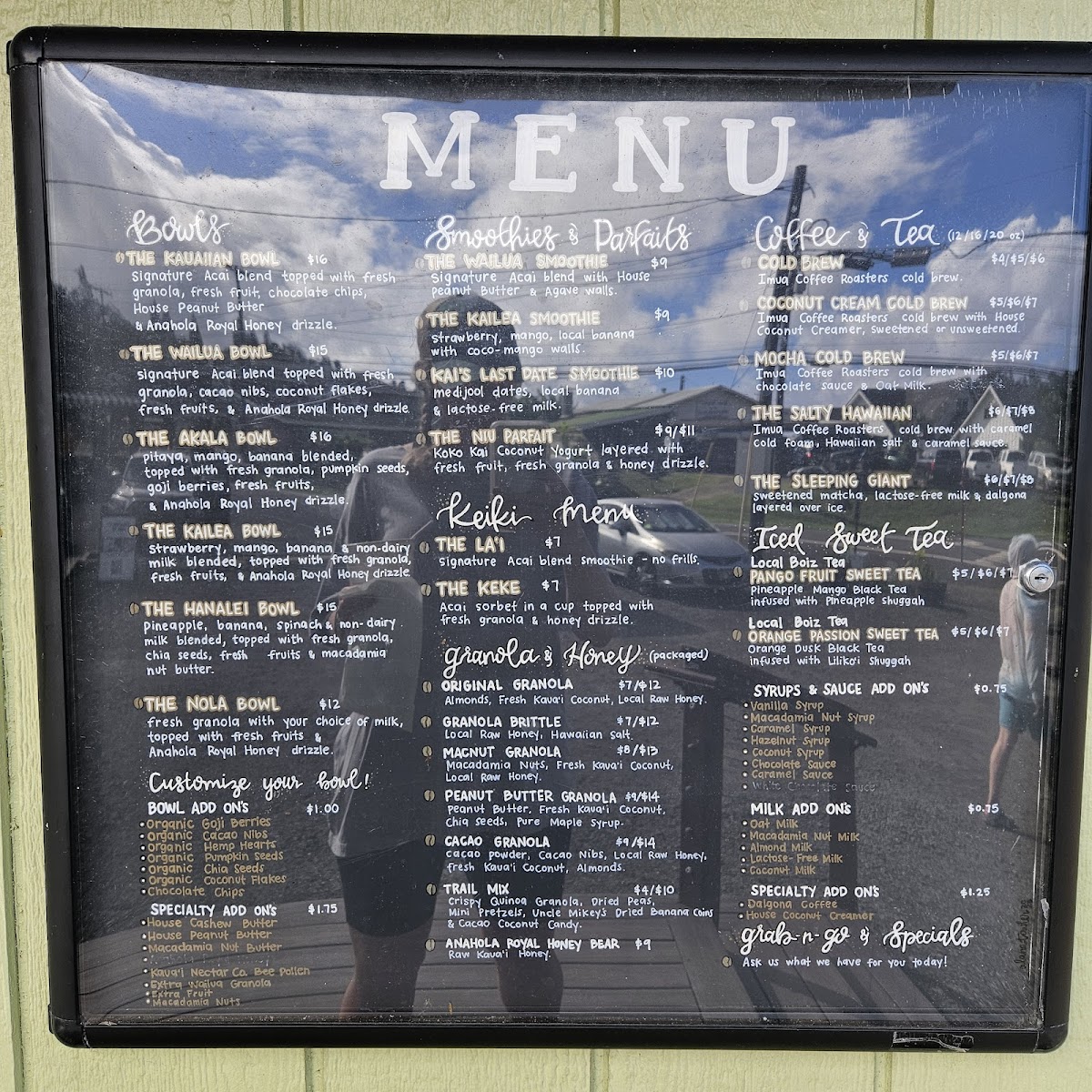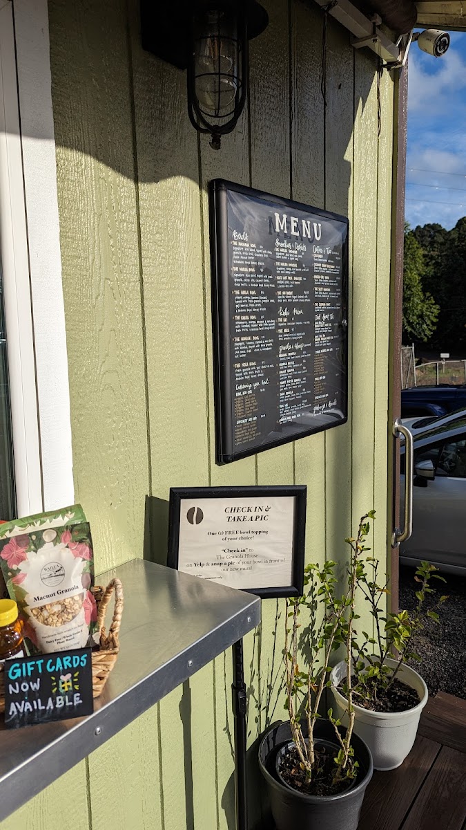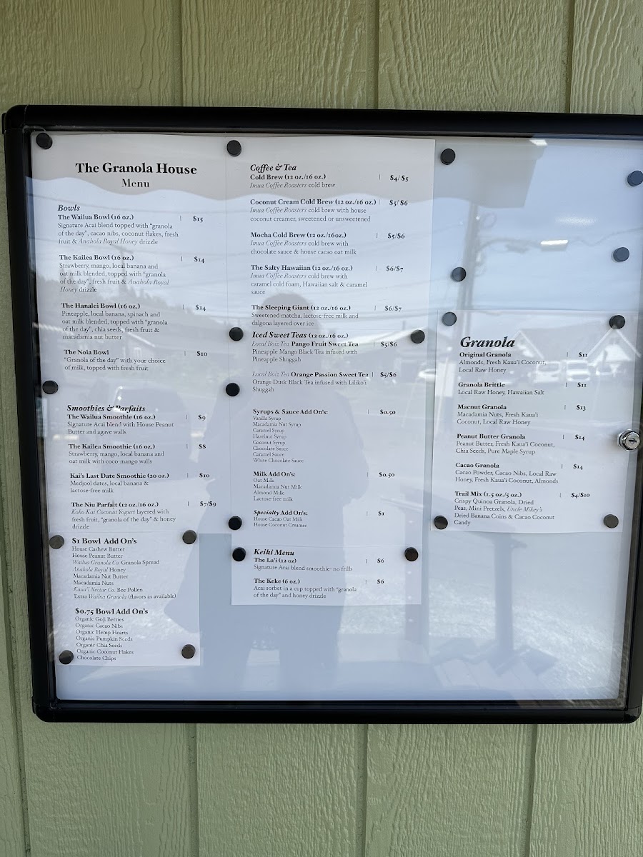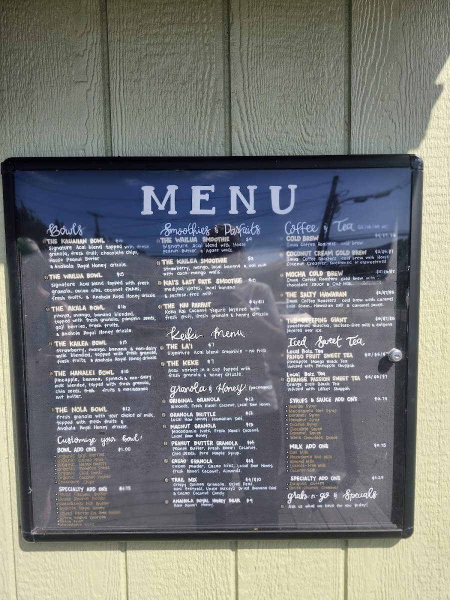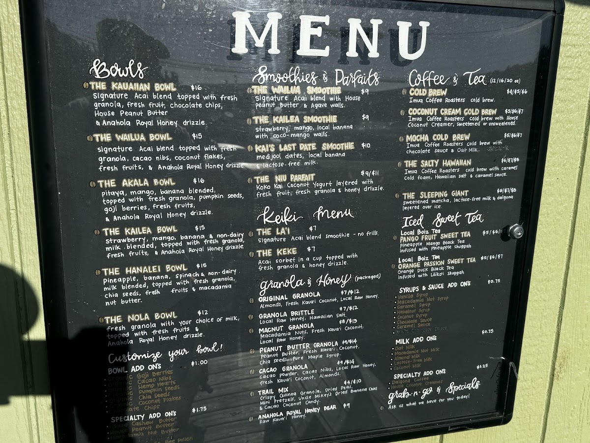 The menu at The Granola House offers a delightful variety of options for breakfast, snacks, and beverages, catering to all tastes. For those craving hearty and flavorful bowls, you can enjoy the Kauaiian Bowl, Wailua Bowl, ‘Ākala Bowl, Kailea Bowl, or the Hanalei Bowl, each bursting with local ingredients and vibrant flavors. The coffee and tea selection is equally exciting, featuring refreshing choices like the 24 Hour Cold Brew, Coconut Cream Cold Brew, The Salty Hawaiian Mocha Cold Brew, and The Sleeping Giant. Smoothie lovers will appreciate options like the Wailua Smoothie, Kailea Smoothie, and Kai's Last Date Smoothie, while those with a sweet tooth can indulge in the Niu Parfait. For younger guests, the Keiki Menu offers delightful choices such as The La'i and The Keke. Don’t miss the selection of packaged granolas, including Original Granola, Granola Brittle, Macnut Granola, Peanut Butter Granola, and Cacao Granola, perfect for taking a taste of The Granola House home. With its diverse offerings, The Granola House presents a menu that celebrates the fresh, tropical flavors of Kauai in every dish.